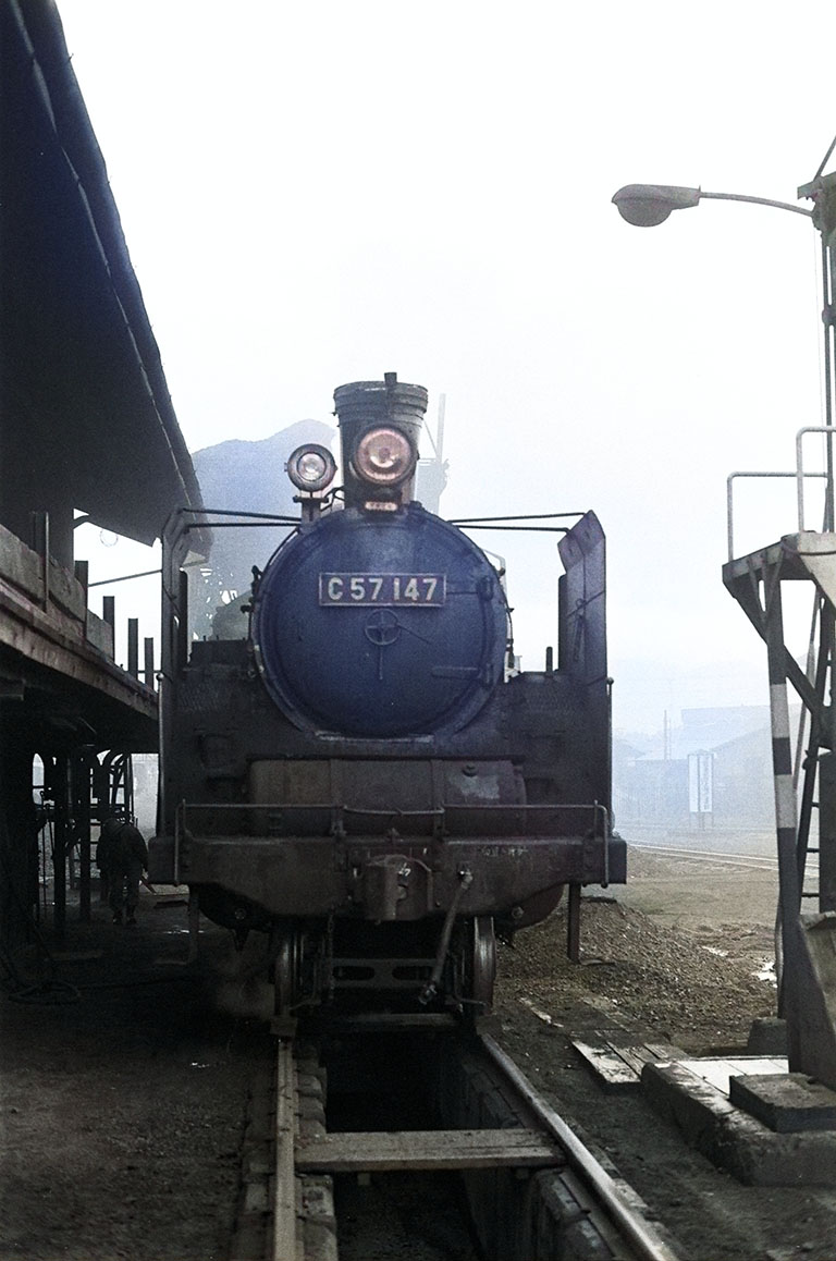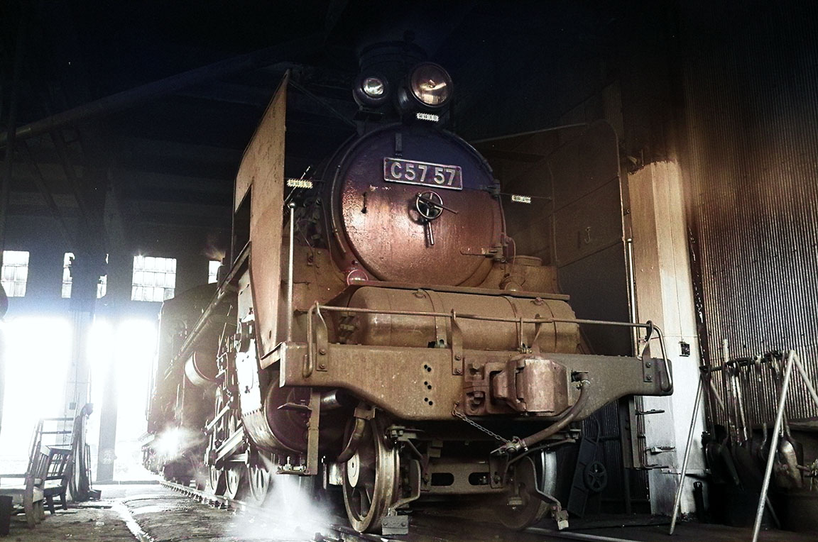 次はまた庫の中に入っての撮影です。今では考えられませんが、半世紀前は許可こそ取る必要がありましたが、許可さえあれば構内撮り放題でした。当然庫の中に入っても全く問題なし。ただし今でも京都鉄道博物館に行けばわかるように庫の中はめっぽう暗く(これじゃおやじギャグだ)、庫にアタマから突っ込むのを基本としている道内の機関区では、夜間のバルブ撮影のようになってしまいます。その分前回のC576号機同様、入口から見える空は超新星爆発みたいに輝き、このバランスを取るのが非常に難しいです。機関車は苗穂機関区のC5757号機。今砧公園に保存されているカマです。予備機として、一応現役蒸機の最末期たる1976年春まで車籍があった、最後のC57の1輌でもあります。