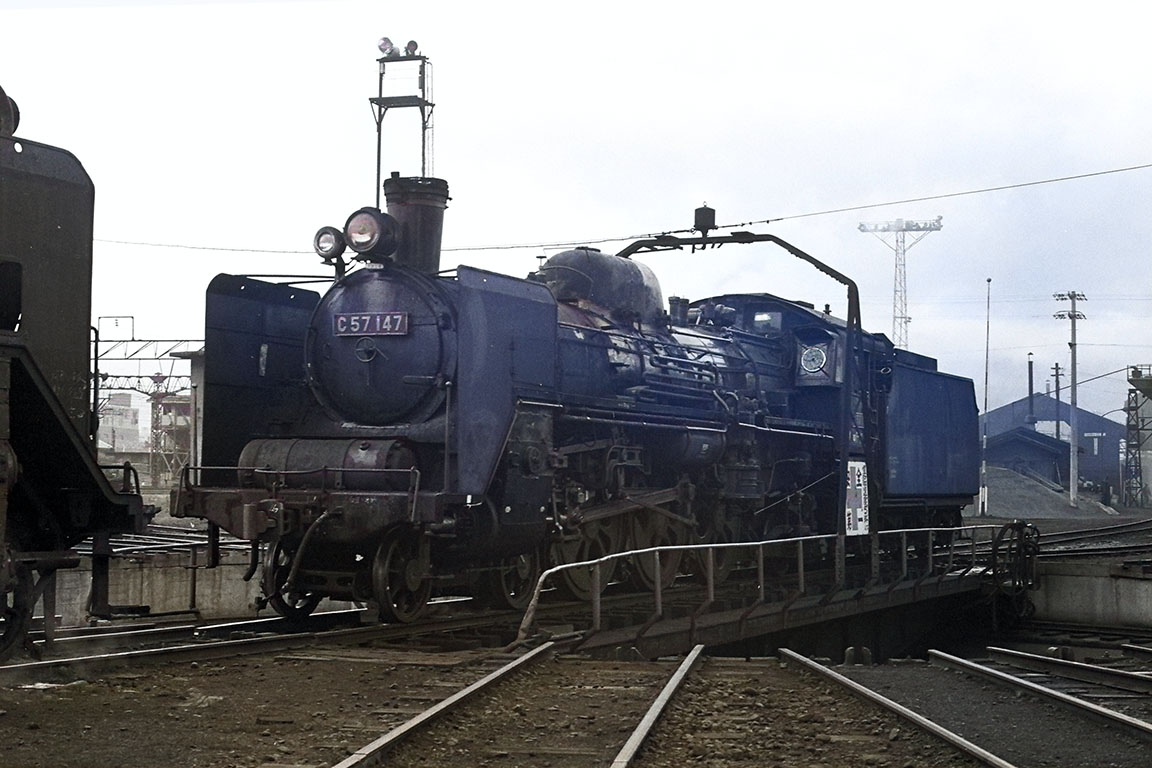 今度は庫の外に出て、再び転車台の主の撮影です。機関車は苗穂機関区のC57147号機。広域配転で和歌山機関区から転属したばかりの頃です。とはいえ1年ちょっとで廃車になってしまうのですが。ずっと近畿地区で活躍していたので、ピストン弁点検用に蓋付改造したデフ・煙室末端の角型化やキャブの採光改良改造など、鷹取工場持ちのカマの特徴がでています。キャブの前面窓は、なんと採光改良で出窓化されたものに旋回窓を取り付けるというほかに見ない改造ぶり。しかし窓ガラスが斜めに上向きになっているので、これでは雪が付きまくって大変なのではと余計な心配をしてしまいます。なんかナンバーに薄っすら赤が入っていますね。かなり前からAI君は「赤ナンバー」が好きなのは見て取れましたが、何かそういうの学習しちゃったんでしょうか。