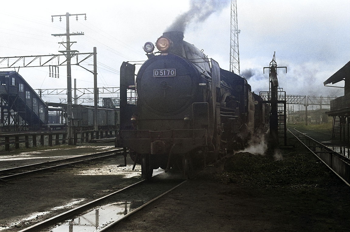 先程転車台上で撮影したD5170号機は、出発線上でC58415号機とD51394号機の前に停車しています。この日は「蝦夷梅雨」で雨が降ったり止んだり。この時は雨が上がったばかりで、バラストがほとんど見えない地面には水たまりができていますが、空には薄っすら陽射しも感じられます。この辺の感じは、なかなか上手く処理してますね。鉄道に限らずAI君は「雨の情景」をマスターしているのでしょう。前照灯は微妙な表現。当時の前照灯は点・滅の間にぼんや光る「減」が入っていましたから、そんな感じに見えないこともありません。これも遠景の苗穂駅がいい感じです。なぜか貨物の発着線に窓無しのワキ1がいますね。道内の特定運用に専用で使われていたのでしょうか。