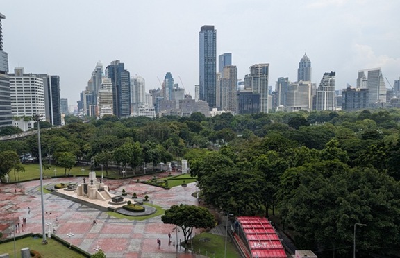 それはともかく、そのオープンしたばかりのセントラルパークに行く。そこには屋上庭園(というほと立派な庭園ではない)があり、そこからルンピニ公園が見える(写真右)。なかなかいい眺めである。ただ、この日はあいにく雨で、写真は撮った後すぐに建物の中に戻った。