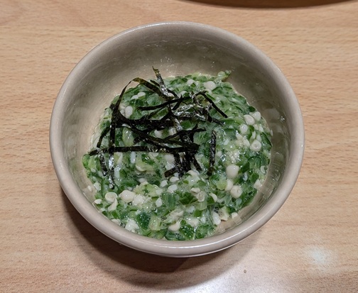 日本風の居酒屋といってもまあ日本にある居酒屋と変わらず、最初に突き出しが出てくる。今日の突き出しは「きざみオクラ」であった。オクラは夏野菜であるが、といっても年中30℃越えのタイでは夏野菜といってもピンとこないだろう。まあくだらないことはともかく、ちょっと塩気があり、上に載っているきざみ海苔が何とも微妙で(いい意味で)美味しくいただいた。ビールを飲んでいたのだが、日本酒の方がよかったかもしれない。
