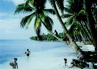 椰子の実は、固い外皮をかぶった厚い繊維層があり、その中にボール状の固い核がある。外皮が青い若い実は、繊維層は白く、ボールの中に甘い水(胚乳液)が入っていている。島民は刃渡り3、40センチの小刀(われわれはこれを蛮刀と呼んでいた)で、器用に果実の肩の部分の繊維層に刃を打ち込んでボールに穴をあけ、中の甘い水を飲めるようにしてくれる。