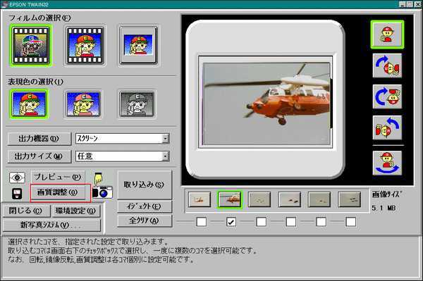 ドライバの段階での補正は露出とガンマ値、ピントのみで、極めつけにマニュアルでの色調整機能を全く搭載していないため、ひたすら自動モードにお任せ仕様になっています。よほどドライバの出来に自信があったのでしょう。実際普通のスナップ写真の範囲なら驚くほど手間いらずです。 6コマの連続プレビュー・取り込みに対応しているのは、当時としては画期的だったらしいです。 |