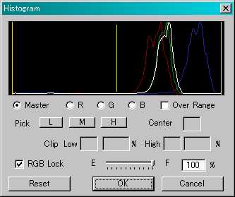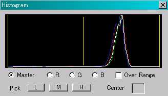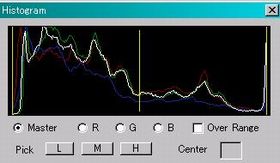![]() ↑が修正後の画像。CoolscanIIIでスキャンされた同一ネガの画像より若干地味ではあるものの、色に関してはそれほど遜色のない画像が出来上がる。 ![]() 修正後のヒストグラム。元画像のそれと比較して、赤(R)が左に、青(B)が右にずれていることが見て取れる。 |