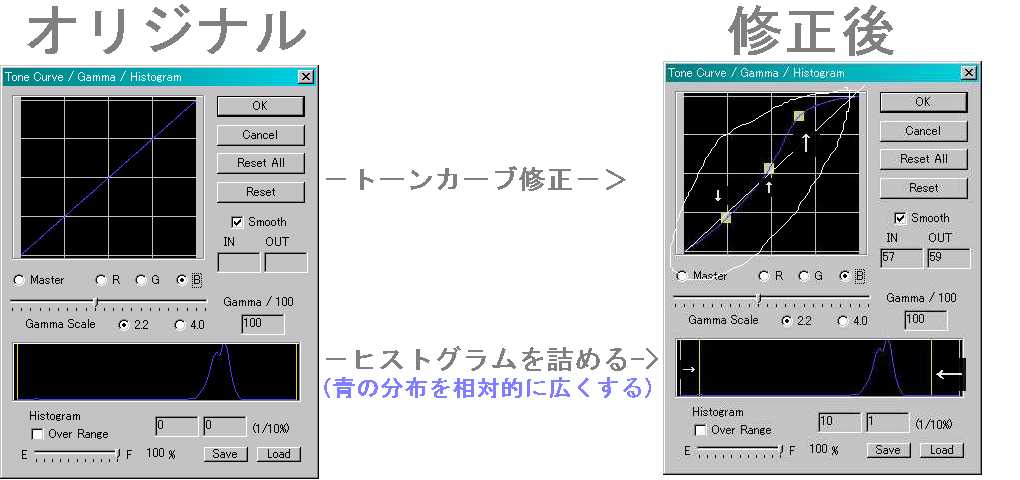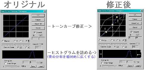 トーンカーブをS字型(鮮やかな青はより強調され、地味な青はより地味に)に修正し、青系統のコントラストを上げる。同時にヒストグラムで青のレンジを右に詰める。 赤・緑については多少直線の中心点をくぼませる・ごくわずかに逆S字(効果はS字型と逆)にする程度の微調整を行う。 |