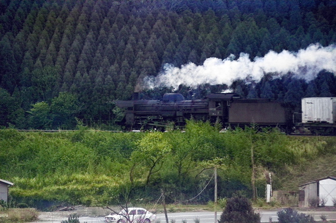 吉松機関区のC5552号機が、下り旅客列車を牽引して戻ってきました。これもモノクロ版の一つ次のコマ。モノクロ版がちょっとした林の手前だったのに対し、これは林を抜けたところ。これも、バックの道路とクルマに興味があったのでこっちのカットを使いました。これも夏景色のようになっていますね。枯草まで緑に染めてしまっています。でもまあこれはこれで雰囲気は出ています。とはいえ緑が濃くてちょっと目に痛いですね。機関車と客車はいい感じなのではないでしょうか。機関車のウェザリングはいいけど客車はちょっと艶を出し過ぎか。なんか全検出場直後みたいな雰囲気です。しかし、そういう風に見えるように仕上げてきたと言うのは、これはこれでウマくこなしているともいえます。