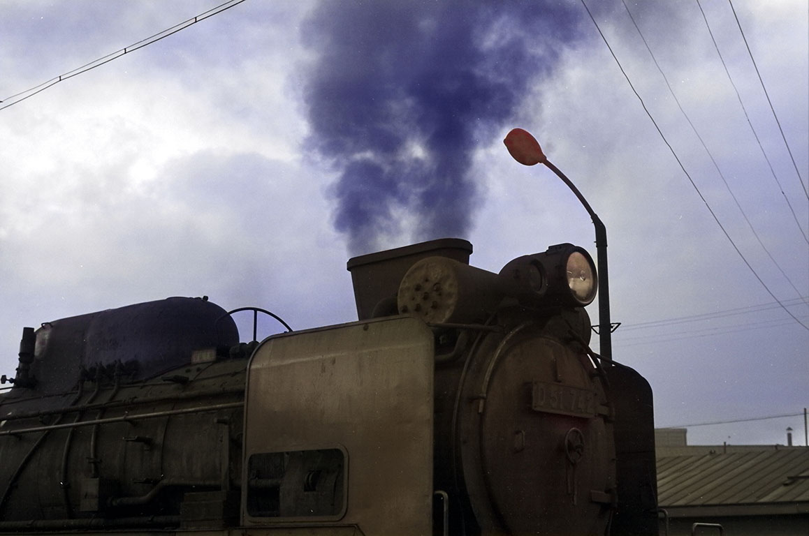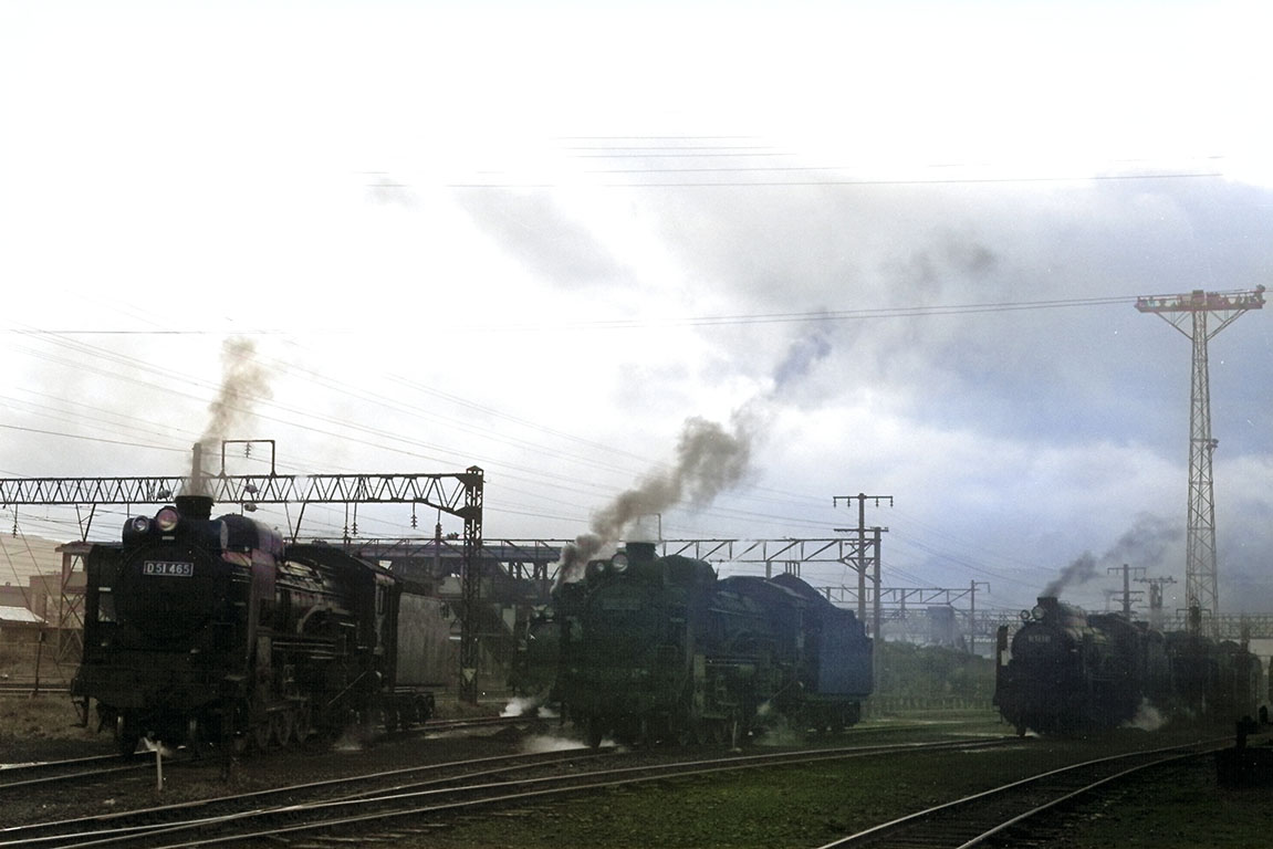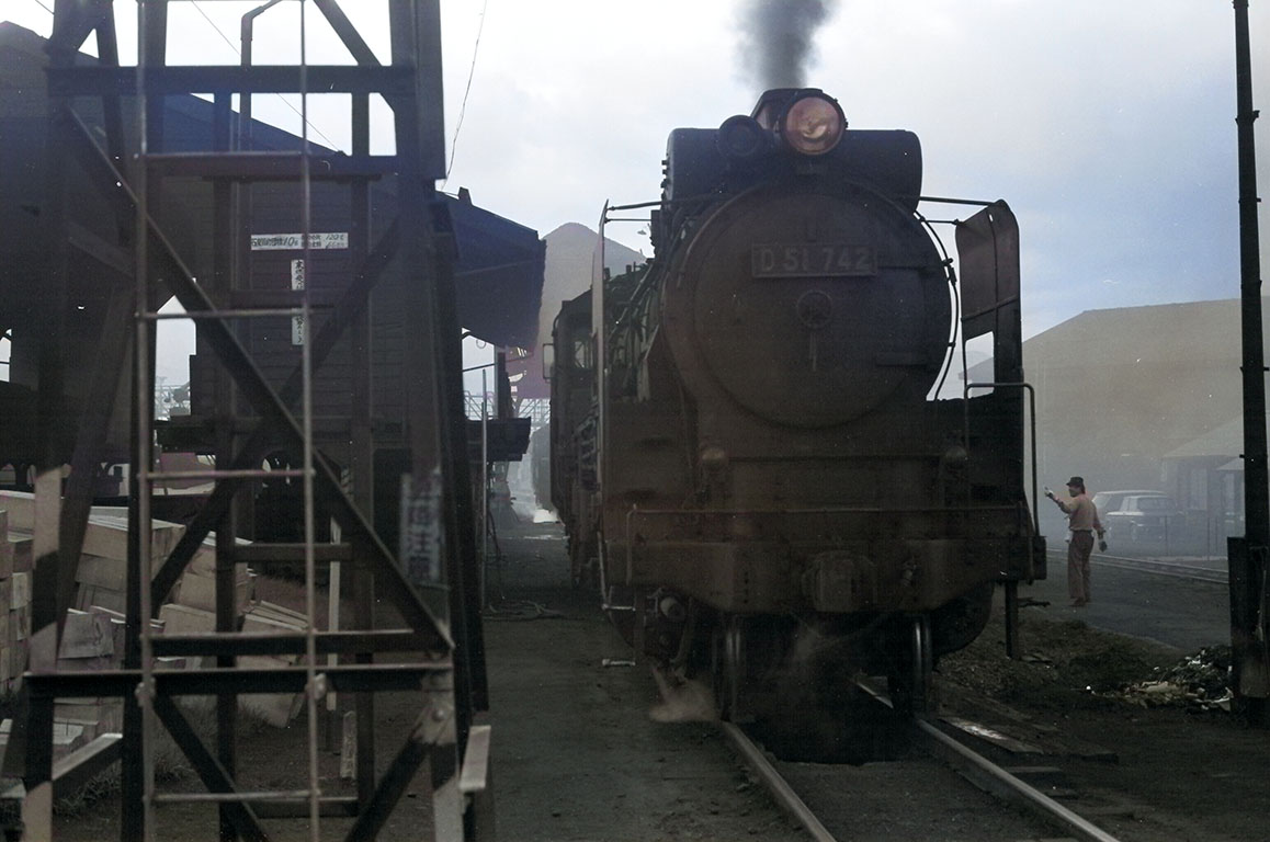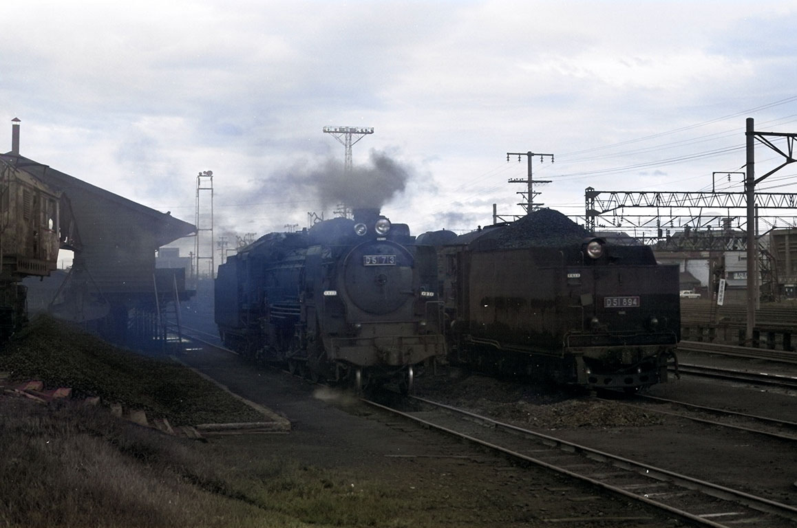 給炭台の線のところに佇むのは、小樽築港機関区のD51713号機と鷲別機関区のD51894号機。894号機のテンダはクセが強いですね。同機は折り曲げのない変形デフで知られていたように1944年製の準戦時型でしたので、テンダも上部を木製にした標準テンダを装備して製造されたものと思われます。その分、装備改造されても一般の標準形とはちょっと違う妙に角ばったスタイルになっているのでしょう。しかし本当にいろいろな機関車が入れ代わり立ち代わり出入りしていて、最後の幹線蒸機の機関区という活気が感じられます。この日は走行写真はお昼に宗谷本線のC55を撮っただけで、旭川機関区と苗穂機関区の二か所の構内撮影に終始しましたが、おびただしい数の蒸気機関車と出会った一日でした。