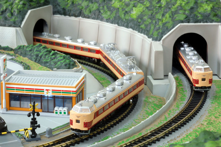 プラスアップのZゲージ485系が、なぜか秋葉のジャンクショップで山積み大特価。もともと食玩で売り出されたモノなので、多くは期待しないが、安かったので購入。帰ってきてから、マルイのレイアウトとの相性を診断。個々の車輌は問題なくカーブを通過するし、モーター車の制御も、マルイのパワーパックで全く問題ない。ただし、ドローバーが問題。ガタが多い上に、余り首を振らないので、特にクロッシングのSカーブのところなど、問題が発生する。また、付随車が軽すぎるのも、推進運転の車輌数が多いときなど、問題を大きくしている。とはいえ、車輌自体は通過するので、カッチリして良く首を振るものにドローバーを作り直し、先頭車に多少補重すれば、マルイのレイアウトでの利用は問題ないと思われる。
