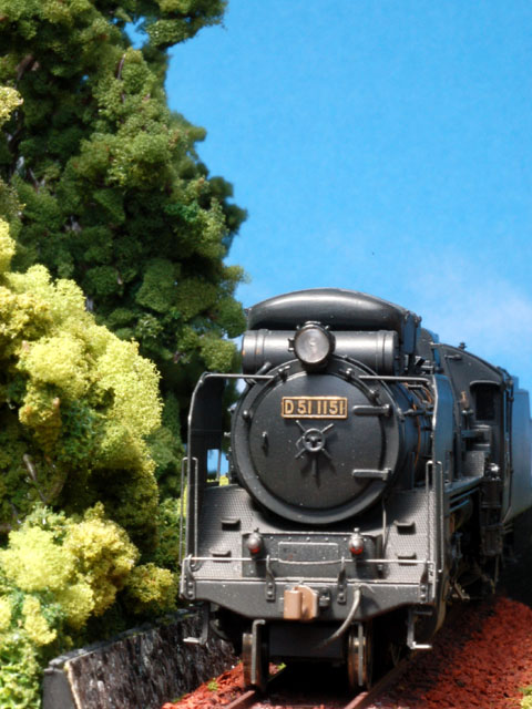 今日は久々、朝から晴れているので、これまた久々の撮影。この前再生して塗装した、スハフをフィーチャー。とはいっても、まだレタリングを入れていないし、韓国製みたいに、幌枠まで車体色だったりと、半完成状態ではありますが。で、複線ジオラマ。もともとありえない地形なので、あまり現実的な考証は考えないことにして、D51標準型にしてお茶濁し。線路容量が逼迫している区間だけの、部分的な複線化なら、準幹線区間でもけっこう見られたし。早く、架線柱建てようかな。