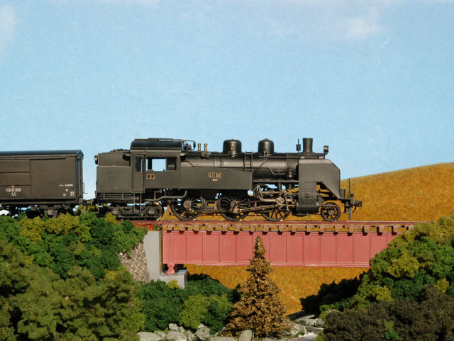 やっと晴れたし、ジオラマもまだ手を加えたいところがあるものの、ひとまずカタチになったので、記念撮影。しかし、地面モノは天気が悪いと、塗料や接着剤の乾燥が遅いので、毎日ちょっとづつしか作業が進まず、一週間かかってしまった勘定。この手の「お立ち台ジオラマ」としては、エラく時間がかかった感じ。しかし、こういうジオラマは、単体では写真が撮りにくいんだよね。川が谷になっているので、俯瞰で撮りたいけど、バックに森みたいなのを持ってこないとできないし。せめて端のところに、木を植えたほうがいいかな。