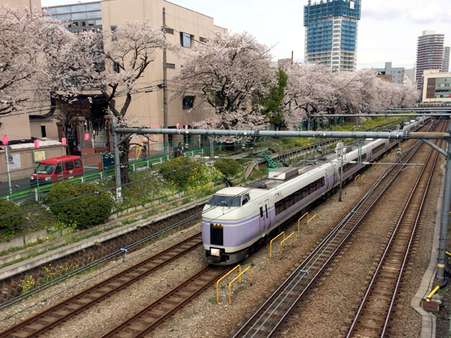 昨日は、中野に行く用事があったが、東中野の桜が満開なのに気付き、ちょいと立ち寄る。しかし、こういう時に限って、いつも持っているコンデジすら持っていない。ということで、スマホで鉄道写真を撮影するという、初の体験となってしまった。まあ、昔のコンデジと同じで、画面を見ずに被写体を裸眼で押えつつ、タイムラグ分を逆算してシャッターを切ればいいのだろうと言うことはわかっているので、まずはやってきた233で試す。まあ、なんとかなりそうな感じがしたので、次にやってくるはずの「あずさ」を狙う。結果的には、妙な収差の歪みが入っているものの、鉄道写真を「撮れる」人なら、スマホのカメラでも充分列車撮影は可能というのが結論かな。ちゃんと「ホチキス」ギリギリのところで止まっているし。しかし、シャッターを切る呼吸感が、なんかビューカメラで4×5の撮影するような感じなのが不思議。画面サイズのせいかな。
