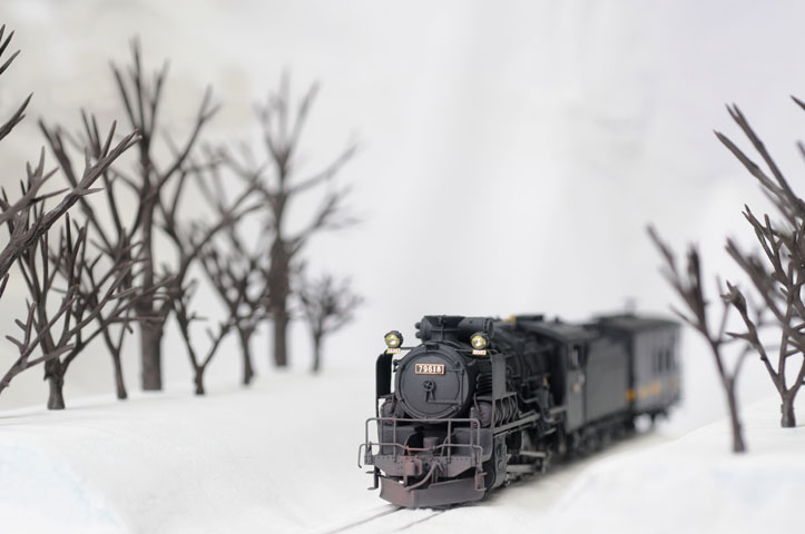 ということで、朝サクッと雪景色のジオラマでフォトセッション。自営になると、予定のパターンが週単位ではなく、日単位になるので、平日でも時間があればこういうことができるのがいいところ。このジオラマはいろいろな演出が考えられるのだが、ひとまずはオーソドックスに被写界深度を浅くして、白バックをぼかして雪が舞っているようなイメージで。こうやってできちゃうとシンプルに見えるんだけど、雪は難しいわ。地表の細かい凹凸を埋めて潰すように降り積もるから、その滑らかさを出さなくてはいけない。さらに実際の雪原はおそろしく広い範囲が均一なんだが、模型でそれをやると単調で間延びしてしまうし。まあ、いろいろ基本技は編み出したんで、これからは何とかなりそう。しかし、レイアウト全体をこの手法で仕上げるというのは、ちと手間がタマらんぞ。