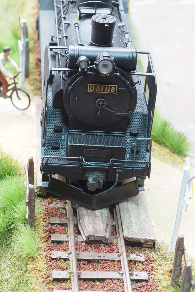 ジオラマは、写真撮影用の仮設セットのように見えるところだけ作り込むやり方もあるし、そういうものも作ったことがあるが、本来は全方位から眺めて味わえるように作るものである。そうすると、思わぬアングルから見た時の面白さもまた楽しめる。「築堤の踏切」のお立ち台を床においておいたのだが、それを上から眺めると、これはなかなか新鮮な構図ではないか。ということで早速撮影してみた。実物では跨線橋や歩道橋がないと撮れない絵面だが、こういう感じのアップも中々面白い。「満腹感」で普通の構図に飽き足らなくなってしまった感じなので、かつて「満腹感」を味わった数少ない体験の北海道型で。