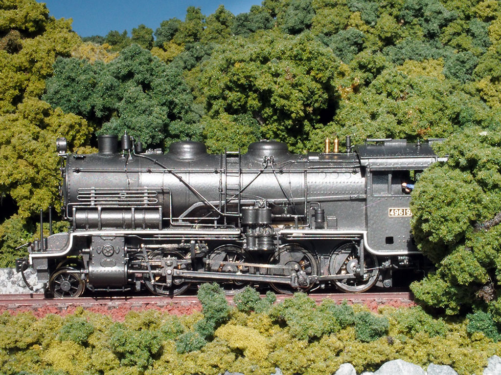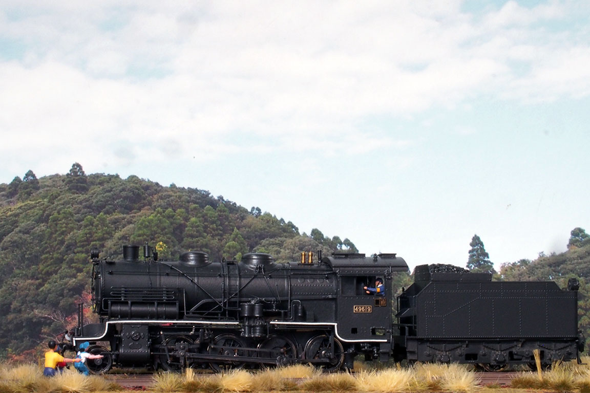 このところ前線が停滞していてすっきりしない天気が続いていたが、本日は久々の秋晴。ということで、久々のフォトセッション。だが新作が少ないので、今のところ最新の49619号機をまた使用。やはり特徴のある公式側の側面を強調した構図がいいだろうということで、懐かしい「釣り人のジオラマ」を引っ張り出す。結構天然ウェザリングがかかっていて色がくすんでいるなあ。まあ、そこは多少埃を払うくらいで。こうやってみると、手間はかかったもののフレームを全交換して良かった、というかそれ以外動かなくなったイコライザーに対処する方法がなかったからなあ。