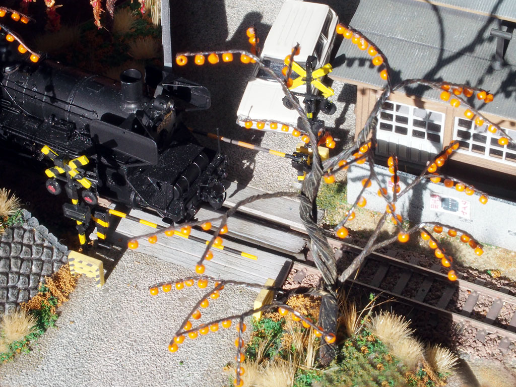 「毒を喰らわば皿まで」ではないが、手を付け出したので「秋のジオラマ」を徹底的にリニューアルすることにした。前は箱にしまえるように木の大きさがをベースからはみ出さないように抑えていたのだが、枝ぶりを広げた方が、紅葉も柿も存在感があって引き立つ。ということで、デカい柿の木を作ってこれをこのジオラマのランドマークとし、前の柿の木はサブとして移植して柿が目立つジオラマに改装することにした。メインの柿の木は、昔中古のジオラマを改造するときに外した木をベースに葉を落とし、例のビーズを接着するという「更新修繕」で製作。サクッと作業してひとまず完成。