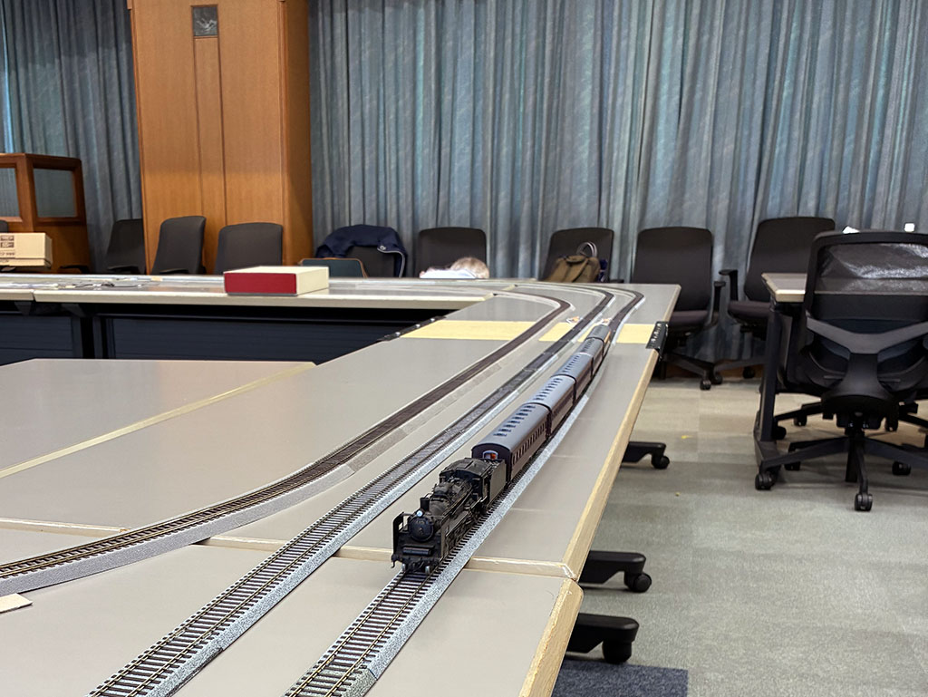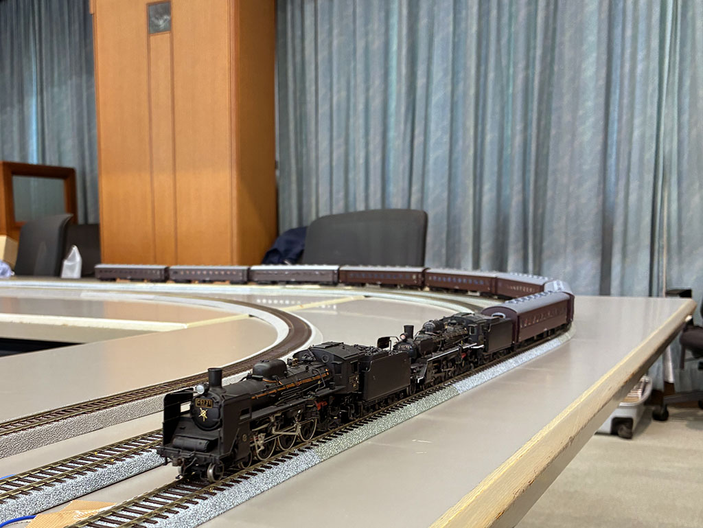 蒸気機関車現役時代に撮影地で知り合った友人の長谷川さんの所属する武蔵工大(現東京都市大)鉄研OB会の運転会に参加。大学のホールを借りて年に数回実施している。このところいつも声をかけていただいているので、毎回参加している。16.5㎜と9㎜とそれぞれ線路を敷いてのマルチゲージ・マルチスケールの運転会。16.5㎜の方で、HOスケールもしくは16番での参加だが、このところは運転会用に持っている16番の量産品での参加が多かった。今回も16番での参加だが、このところちょっとハマっていた「70年代・80年代の模型店特製品ジャンクの再生」を持って行く。ヨーコーシャの「ターミナル」特製のC571号機と、製作店調査中(ほぼ推定はできているが検証中)の佐倉機関区のC57だ。どちらもモーターからオーバーホールで再生したので長時間うまく動くか心配ではあったが、さすがにスピードは出ないものの脱線もせず長いエンドレスを走り続けてくれた。走らせているうちにだんだん調子が上がってくるのは、さすがアナログな昭和時代の模型だな。長時間運転に耐えるかどうかが心配だったので、予備機にデフが無くなってしまっていた天プラのC57ジャンクを再生した72号機を持っていったので、71号機・72号機の重連。模型ならではのおバカな遊び。とはいえ、新製から昭和20年代まではこの両機は東京局配備で常磐筋にいたので、その時代には組んだことがないとは言えないのだが。