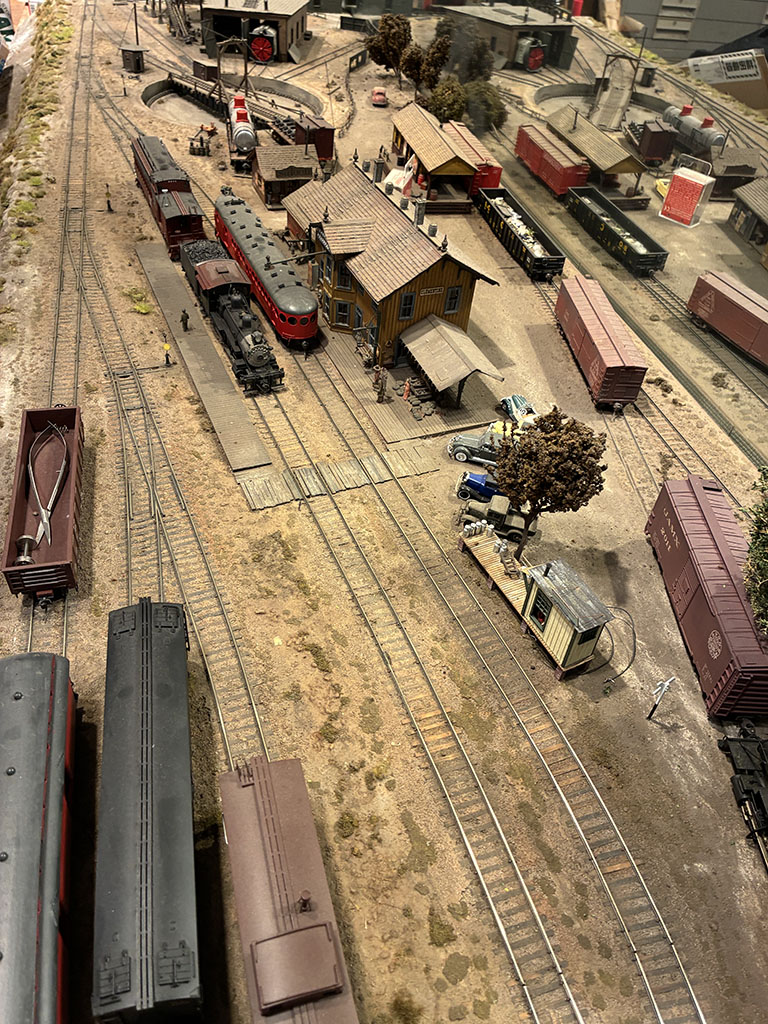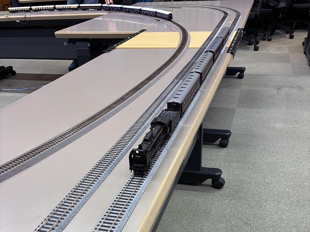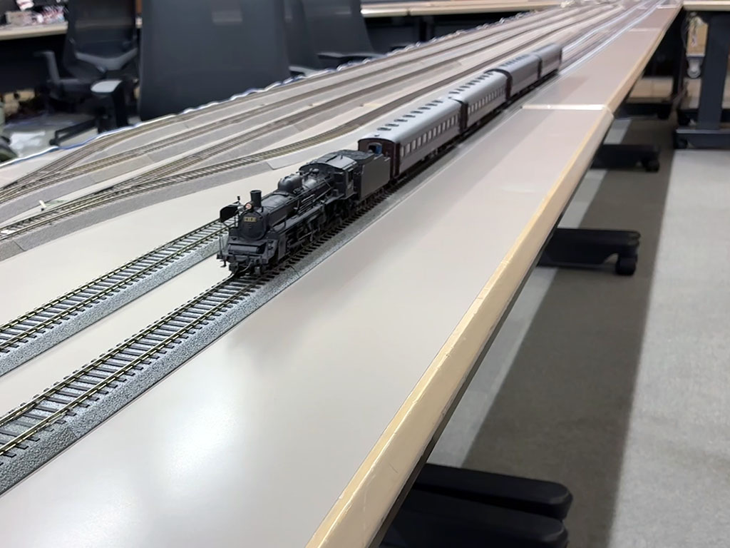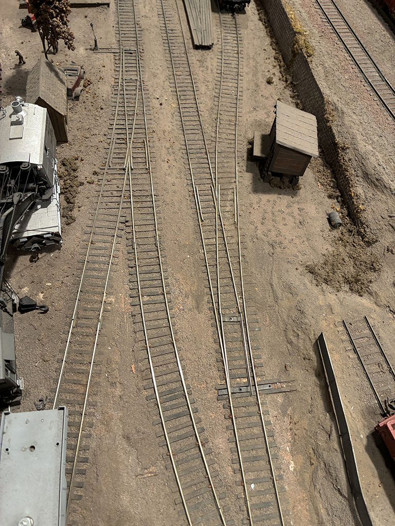松本謙一さんの自宅地下室に建設されたレイアウト、D&GRN。氏の動向をよくご存知な方ならもうおなじみだろうが、ドッグボーンタイプのリターンループのところに平井憲太郎さんがガラスのテーブルを作り、「バー・クレッセント」として来訪者をもてなすようになって数年が経つ。最初に設営された時に招かれてそこで松本さん平井さんとワインのグラスを傾けていた時、ちょうど対角線の向こう側にあたるクレメンタイン支線が目に入った。あそこもお客さんが楽しめるスペースにすればいいのに、それも模型を走らせて。ということで、「ぼくが再生します」と言い出してついにその時が来た。本日より支線再生プロジェクトがスタート。まずは線路状態のチェックとテストランまで。フィーダー配線はないので、ブロックごとの試走だったが、ひとまず問題がないことを確認。さすがに踏面は錆び錆びだったが、本線同様半世紀を経ても線路自体はびくともしなかった。かえって踏切の敷板とかが、膨張して線路にせり上がっていたりする方がトラブルの元だったが、それも松・謙さん愛用の彫刻刀で削ってひとまずクリア。半世紀ぶりに蘇った支線の線路の輝きを。