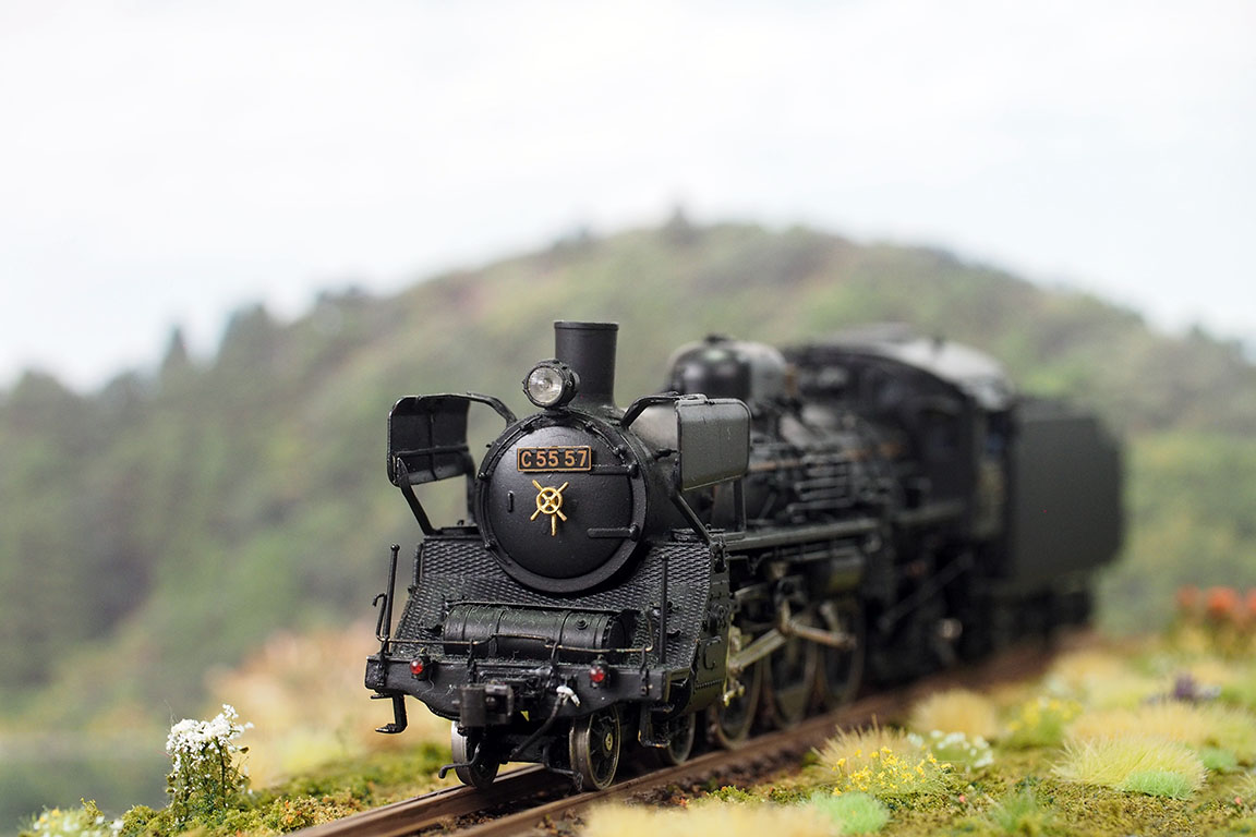 先の週末はいろいろ鉄道イベントをやっていたようだが、今日が「鉄道の日」。それとは関係ないのだが、ひょんなことから安達ベースの13mmC55形式のエンジン部分のみのジャンクが手元にやってきた。3次型の九州小工デフ仕様で、特定番号ではないかワリに良くできているし、作風も近い。16番に戻すことも考えたが、このまま13mmで再生しても面白かろうということで、そのまま修理。テンダをどうしようかと思っていたところに、シュパーブのD51一次型のテンダのジャンクが出てきた。九州のC55の3次型はD51とテンダを振り替えたカマも多いので、これを落札して車輪を付け替え(これの入手に苦労した)、最低限の加工(増炭板の取り付け等)だけ行ってひとまず走らせられる形になった。しかし、記念に写真を撮るにしても13mmではジオラマがない。16.5mmのお立ち台の一つに13mmの線路を敷き、三線軌条としたものを作ってやっと撮影。テンダにほとんどディテールがないので、被写界深怒を浅くしてゴマかす。まあ、プラ量産品1輌程度の出費でけっこう楽しめたから良しとするか。しかし、機関車一台ではなあ。13mmの車輪さえ入手できれば客貨車は16番と「二刀流」で使えるのだが、けっこう車輪が入手難のようだし。まあ、オークションで地道に探すか。