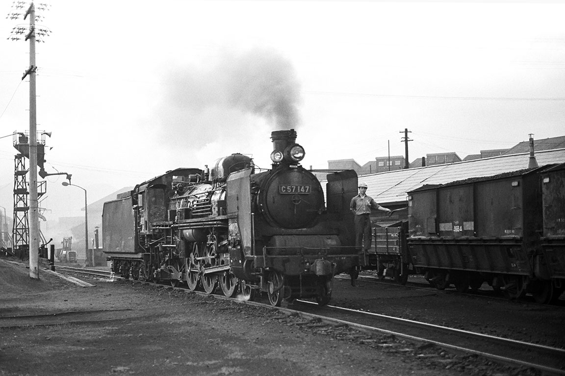 まずは給砂塔のあるアプローチ線から、転車台に向かう苗穂機関区のC57147号機。この角度から見るとLP405副灯こそついているものの、煙室先端の角型化や蓋付きのバイパス弁点検穴など、鷹取工場持ちのC57らしい特徴が色濃く残っています。こういう気遣いがリアル感を増すんですよね。誘導係は北海道の定位置たるフロントデッキ上。このカマは踏段改造がなされていないので(72年時点では、C57は未改造)、掴み棒を後ろ手に握り、足は解放テコとの間という、かなり苦しい姿勢です。降雪時の安全を考えると、踏段改造が広まったのも納得できます。まあ誘導係など地上職員が所属する国労が北海道では強かったというのもありますが。後ろのセキは「道外禁止」が入らない、初期型の黄帯ですね。