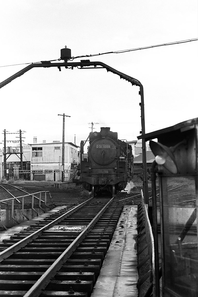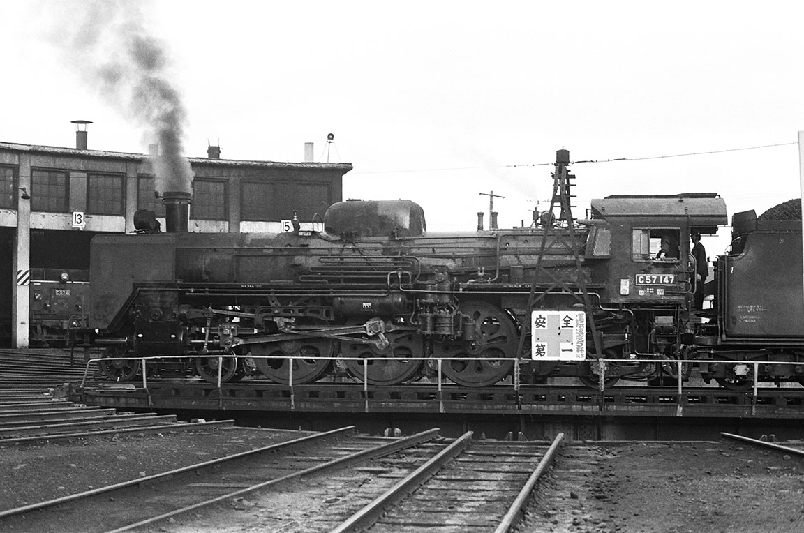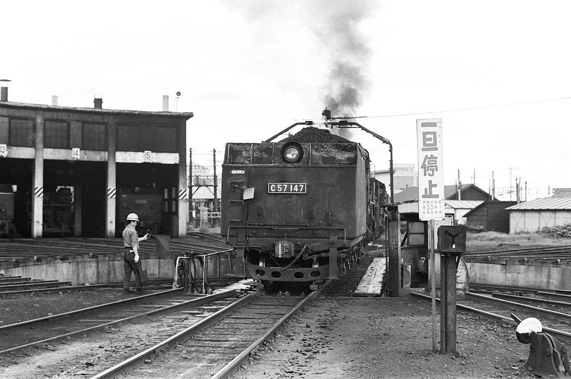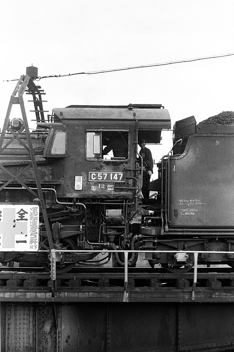 静々とターンテーブル上に進入するC57147号機。テンダーについては、ほぼ後部前照灯と増炭板だけの改造で、北海道仕様の特徴的な装備は付いていません。誘導係は「一旦停止」のところで停止した際に降車して、隣の線路のところで指差確認をしています。こうやって見ると、シャツは私服ですね。まあ、国労組合員はヒドい恰好してましたからね。下は制服のようなので、夏なので制服の上着を脱いでいるというところでしょうか。レイアウトの資料として、ターンテーブル廻りの雰囲気を撮影したカットでしょう。この一連の未発表カットには、明らかにこういう模型資料として撮影したものが多く、それゆえ写真としては公開していなかったのでしょう。