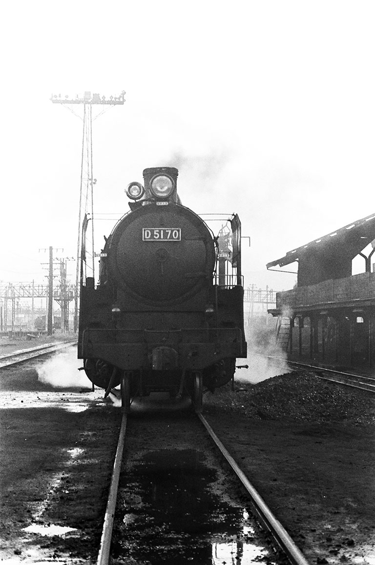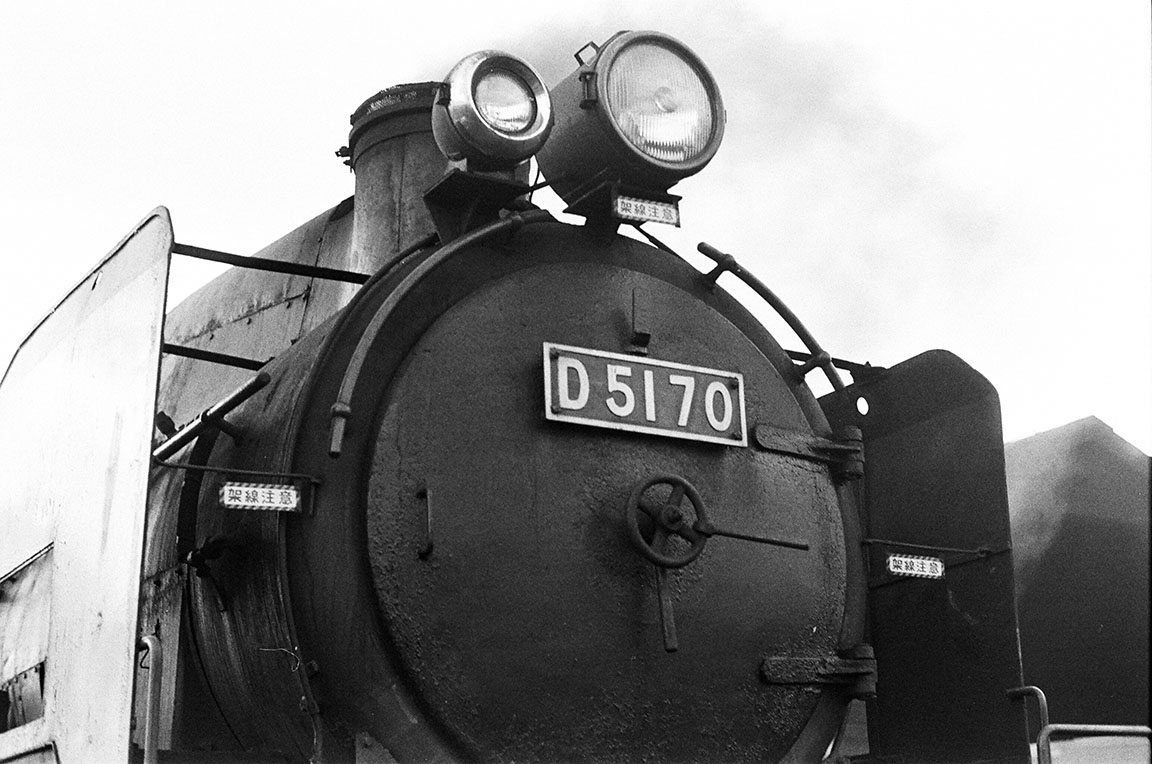 出発線のところに戻って、再び小樽築港機関区のD5170号機を被写体とします。まずは真正面からのカット。蝦夷梅雨の最中のこの日は雨が降ったり止んだりで、激しく降り出したときは庫の中での撮影に切り替えたりしていました。そんなわけで線路の中には水たまりができています。そこに機関車のシルエットが写っているところを入れて撮りたかったのでしょう。マセた16歳だなあ。でもまあ雰囲気は良く掴めています。機関車に絡みつくスチームも、雨が上がったばかりの湿度の高さを感じさせます。真正面から見ると、デフを切り詰めているかどうかわかりませんから、あまり北海道のカマという感じがしませんね。ナメクジドームも見えないので、C59やC60のようにも見えます。