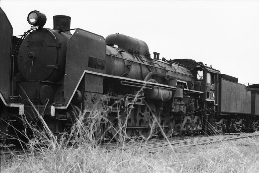 ということで、側線の全景です。手前から、C6112号機、C6113号機、C6131号機、C60107号機、C6132号機です。この当時はまだ、配置されていた機関区に近い駅の空いている側線に、廃車したカマを留置していたので、現役蒸気撮影のついでに、廃車体を撮影することも可能でした。後になると、廃車輛数が増えたこともあり、かなりマイナーな駅にまとめて押し込むようになったので、おいそれと撮影できなくなってしまいましたが。それにつけても、日産サニーと三菱ミニカが、いい味を出しています。