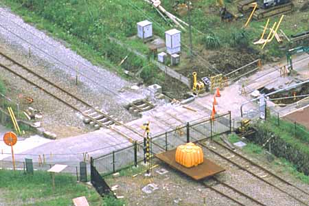 丁度立体交差になると思しき辺り、下り線のレールが剥がされてしまった。いよいよ始まるのか。 (2004.6.19)