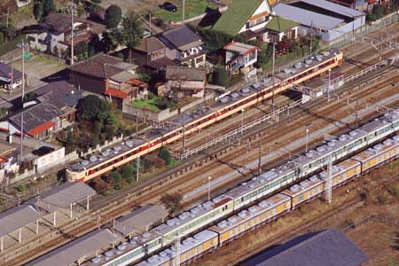 電留線に特急電車が。団臨らしく、ベルビア日和な今日は「SL碓氷号」も走って、沿線も賑わった模様。 (2004.11.13)