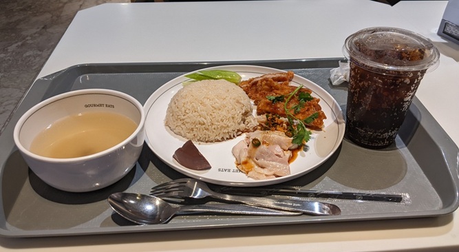 そのあとプロンポンへ移動して、お腹がすいていたので、エムポリアムの4階のフードコートでカオマンガイ(左写真)を食べる。ここのフードコートは比較的空いていて、座席を取るのに苦労しないですむので時々利用している。カオマンガイといっても、タイの伝統的なカオマンガイとは若干異にしていて、私は揚げた鳥肉も頼んでいる(鳥ミックス)。90バーツほど。