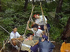 キャンプでは訓練だけでなく、遊びもやります。奥にあるグラウンドでバレーボールがはじまりました。