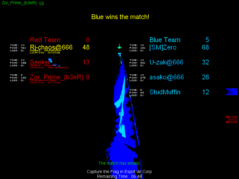 これまた途中まで人数は少なかったんですが、やっぱりping 100な連中とサクリャク成功?のお陰で勝ちました。わあい。画像では潰れてますが、U-zakさんのスコアは「40」です。(旗の袂でカッチョつけてるのはRjです。)