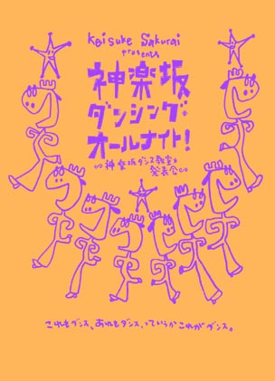 イラスト: 安斎肇Keisuke Sakurai Presents 神楽坂ダンシング・オールナイト! 〜神楽坂ダンス教室・発表会〜 これもダンス、あれもダンス、っていうかこれがダンス。 日時:6月16(金)20:00〜 17(土)15:00〜、19:00〜 場所:神楽坂セッションハウス地下スタジオ 料金:2300 円 「神楽坂ダンス教室」は、ミュージシャン&ダンス批評家の桜井圭介が 神楽坂セッションハウスで行なった「ダンスを作る」ワークショップです。 ここではいかなるメソッドもテクニックも教えません。 自明のものと考えられ勝ちなダンスという形式、お約束をいったんチャラ にしたところで、講師も生徒も一緒に、ダンス経験者もそうでない者も共 に、もう一度「ダンスとは何か?」「ダンスはいかにすれば成立するか?」 を試行=思考する作業と言えるでしょう。その成果、というより途上の姿 をここに謹んでご披露します。 出演: 秋山うり 石野奈織子 小浜正寛 たかぎまゆ 鶴見未穂子 手塚夏子 中村公美 前田愛美 監修: 桜井圭介 予約・お問い合わせ:セッションハウス 03-3266-0461 fax 3266-0772 [ 資料 ] *「ダンス」とは何か?(世界の定説集より) *ダンス再入門〜迂回路を通って〜(ワークショップ参加者募集のチラシより) *何故批評家がワークショップを開くのか? *百メートルを三日で走る by 宮沢章夫